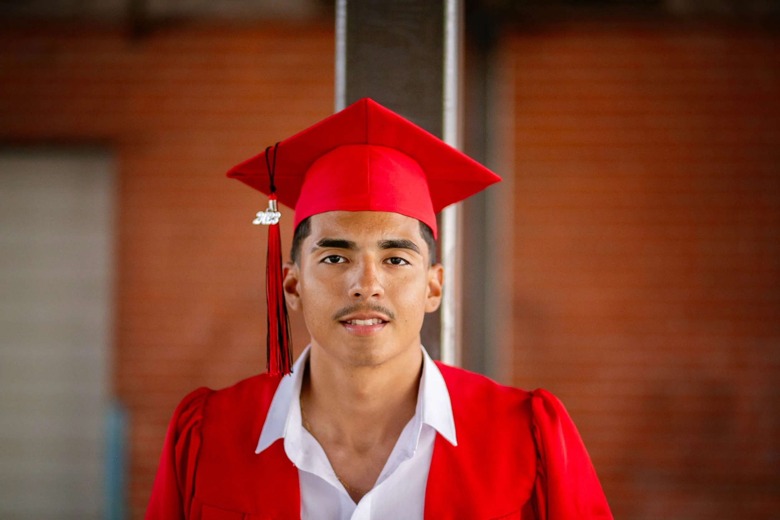 A young man wearing a red graduation cap and gown, standing in front of a brick background.